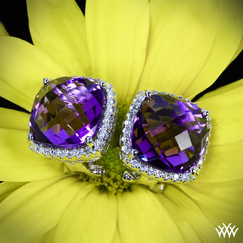 Stunningly beautiful, these Amethyst and Diamond Earrings are the ultimate in glamour. Two incredible cushion cut amethysts (13.67ctw) are surrounded by 56 sparkling Round Brilliant Diamond Melee (0.21ctw; H/I SI). The width of these earrings are ½ inch square. French clips are included. These earrings have immediate availability. If you have any questions then please contact one of our friendly diamond consultants at 1-877-612-6770.