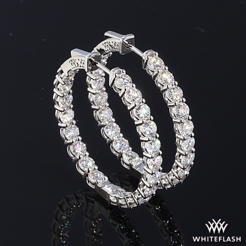 These Classic Inside Out Lab Created Diamond Hoop Earrings are available in 14k White and Yellow Gold with various carat weight sizes. The 2ctw version has 24.6mm inner diameter, the 3ctw version has 26mm inner diameter, the 5ctw version has 26.5mm inner diameter, the 7ctw version has 30mm inner diameter, the 10ctw version has 41mm inner diameter. If you have any questions regarding these earrings then please contact one of our friendly diamond and jewelry consultants.