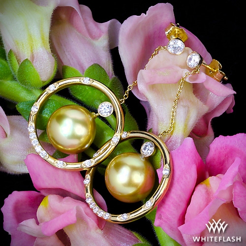 Get in touch with your inner goddess with the help of these “Golden Pearl and Champagne” Diamond Earrings. A spectacular sight to behold the 11mm Golden Pearls are surrounded by 26 brilliant