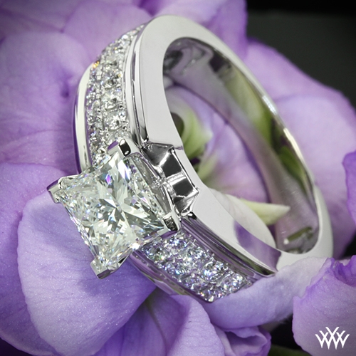 A brilliant flowing design awaits with the "Fiotto" Diamond Engagement Ring. Two rows packed with 28 Round-Ideal Diamond Melee (0.50ctw; G/H VS) enhance the beauty of your center diamond. The width tapers from 6.4mm at the top down to 4.6mm at the bottom. Select your diamond from our extensive online diamond inventory. This ring has immediate availability. If you have any questions about this ring then please contact one of our friendly diamond consultants at 1-877-612-6770. **Only available in size 4, 5 or 6. Pictured with a 1.30ct diamond.**