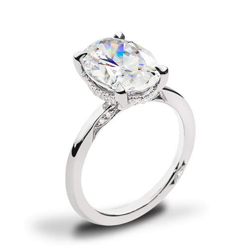 Features a Classic 360 foundation with a high polish finish. The iconic Simply Tacori crescent fabric decorates the ring with delicate diamond and milgrain detailing, while a hidden bloom beneath the crown adds an all-angles sparkle.