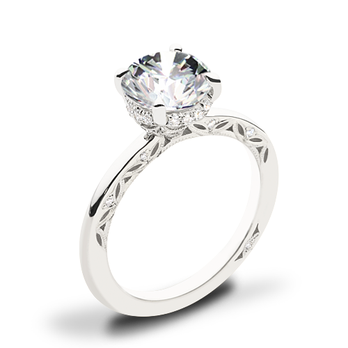 A high-polish ceiling accented with lace-like tracery makes for a stunningly airy setting. The hand-hewn milgrain and pinpoint diamonds add nuance, while a hidden bloom creates dimensional light. A Signature Crescent marks the resting point.