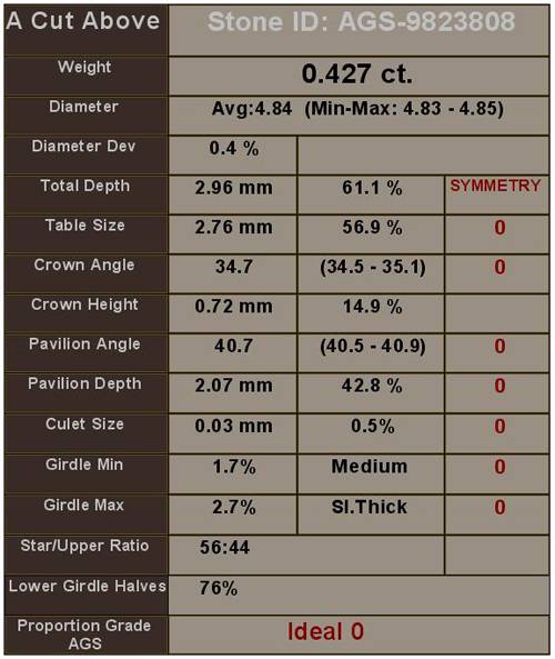 This is an A CUT ABOVE® diamond, our internationally acclaimed super ideal crafted to exacting specifications for maximum light performance, brilliance and fire. It is in-stock and comes with proprietary AGS Certificate and full benefits package. Click on logo for more information about this world class diamond brand.