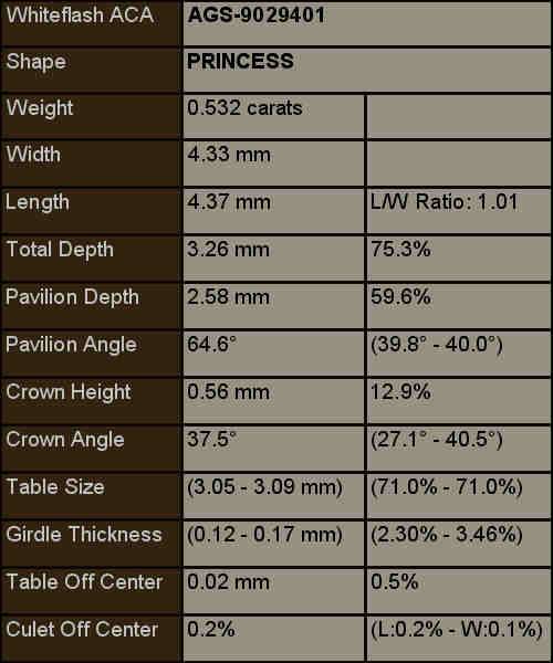Featuring ultimate precision in diamond cut this phenomenal 0.532 carat A CUT ABOVE®  Princess diamond has a clarity grade of VS2, color grade of G, and a cut grade of AGS Ideal. Match this diamond with another certified diamond to make a fabulous pair of diamond earrings.
