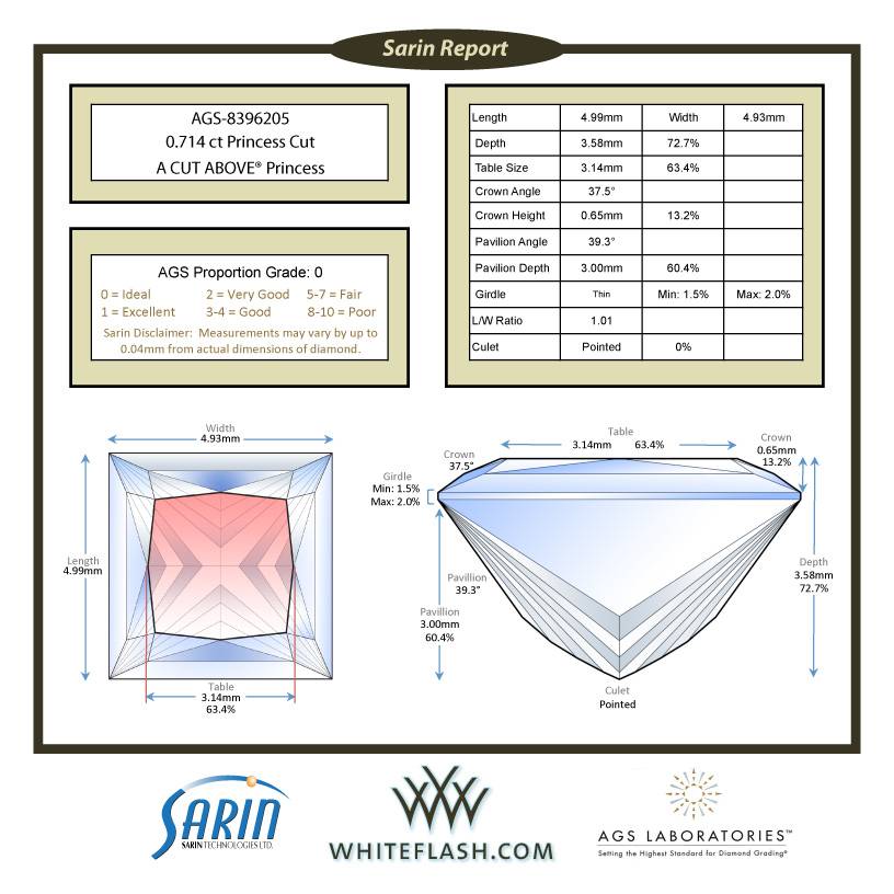The outer dimensions of the diamond expressed in millimeters. Fancy shape diamonds include length, width and depth. Rounds include minimum and maximum diameter and dept.