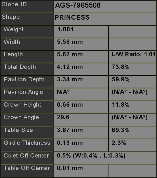 Diamond item codes identify the laboratory (AGS,GIA,IGI) and the specific report number for full transparency and to give customers the ability to run independent report verification. The item code is hyperlinked to the certificate which can also be accessed through the Diamond Certificate link at the top of this page.