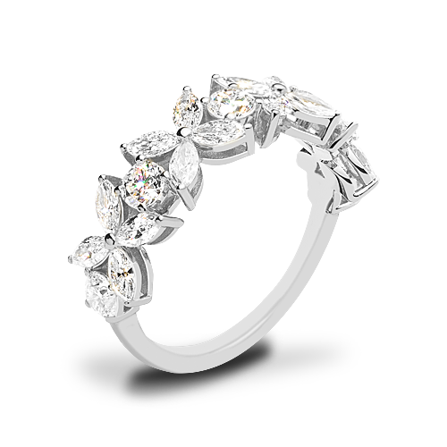 This stunning anniversary ring boasts a unique combination of four marquise diamonds in a beautiful flower arrangement, with brilliant cut round diamonds placed between each one. The result is a breathtaking display of sparkling beauty from every angle. The 3.23ctw. version is shown in all of the images and video.