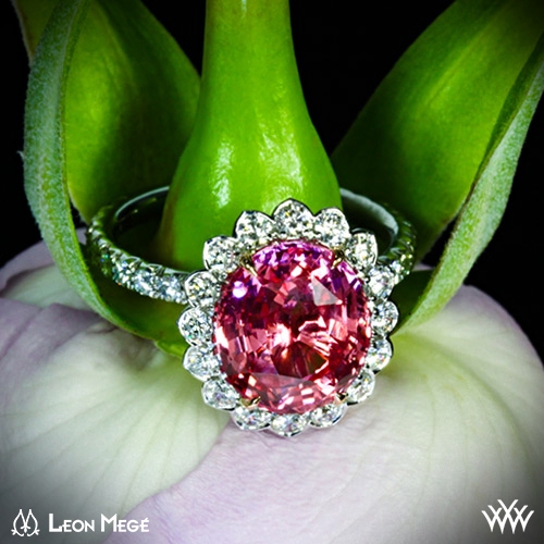 Spectacularly stunning is how we describe this incredible creation by Leon Megé. This "Imperial Lotus Padparadscha Halo" Right Hand Ring is completely customized; it holds a gorgeous AGTA certified natural 5.01ct Padparadscha Sapphire that is surrounded by 40 Leon Megé melee diamonds (0.80ctw; G/H VS) and has 6 pink diamonds nestled in the Rose Gold head. Don’t miss the chance to own this one of a kind masterpiece. The width of this ring is 2mm. This is ring has immediate availability. If you have any questions then please contact one of our friendly diamond consultants at 1-877-612-6770. ** Available in ring size 5 through 7. **