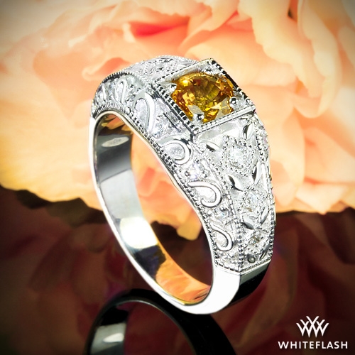 This sensational art-deco inspired ring features a bold 0.81 ct yellow sapphire, the ornate shank shines with 0.20 ctw round brilliant diamond melee (G/H SI) . This ring has immediate availability and is only available for sizes 6-8. If you have any questions about this ring please contact one of our friendly diamond consultants at 1-877-612-6770.